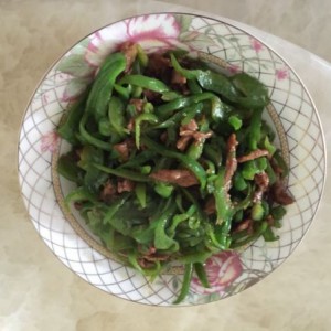 用锅内油炒切好的辣椒丝,放少许盐调味,辣椒快熟时放入炒好的肉丝,如果盐味淡可以适当加点生抽调味,出锅装盘。