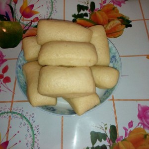 把面团从中间切开,按扁后,均匀的切成长方行的,