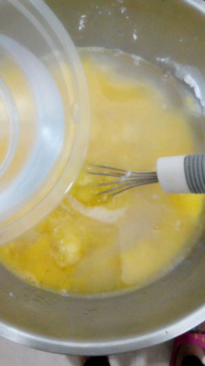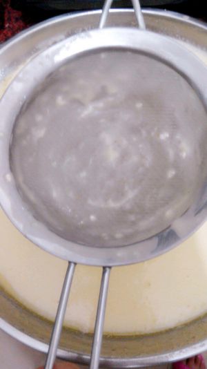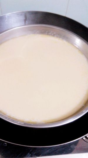 盘子刷上油,把过滤的粉浆倒进去,上锅烧到插入筷子不粘