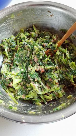 把苔菜和肉馅搅拌在一起;