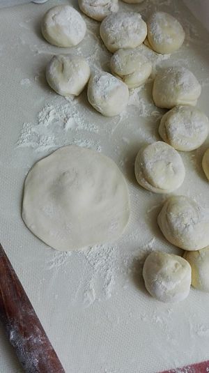 面团揉光滑后,切成大小适中的剂子,擀成四周薄中间厚的包子皮;