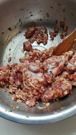 肉馅里加姜粉、料酒、生抽、鸡精、盐,少许的清水,搅成肉馅泥;