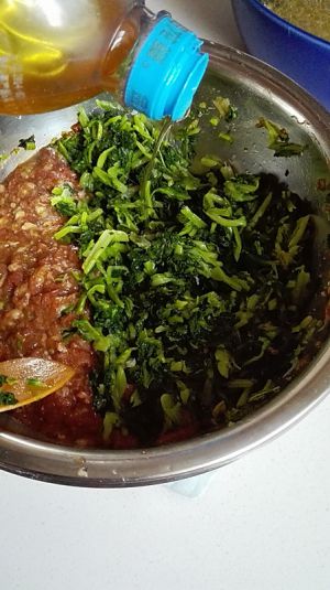 肉馅与苔菜收在盆里,苔菜放适量的盐调味;