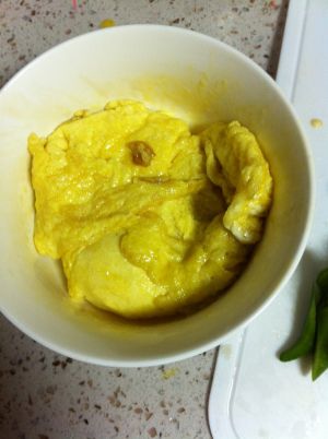 鸡蛋煎到8分熟备用(入锅成形就铲出),因为最后还要入锅炒,煎太熟后面就老了