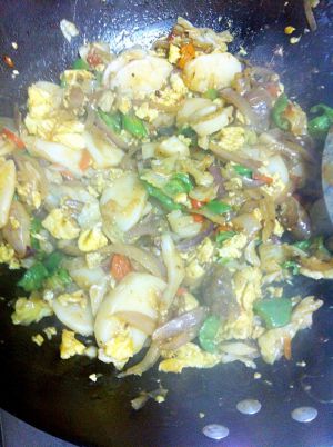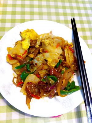 之后把香肠,年糕一起放入炒,加一小碗水,转小火,快出锅前放入鸡蛋和青椒一起炒,转大火急炒,放调料拌匀,就可以出锅啦