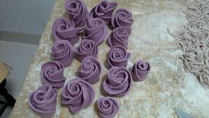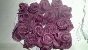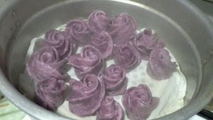 很简单的,跟平时做馒头步骤一样,就是把和面用的水换成煮熟后搅拌烂的紫薯糊。