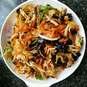 木耳,青椒切丝淖水短生。萝卜切丝用盐淹一下去除多余的水分。