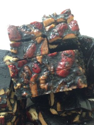 原谅我木有拍照,因为阿胶一边蒸一边用勺子熬,直到融化,这个过程有些痛苦,时间久而且隔水蒸都是蒸汽感觉好烫,图上是成品,在阿胶熬好后依次放入核桃红枣,继续熬至粘稠,最后放入芝麻(我家里本来就是熟芝麻所以不用炒)继续熬啊熬…直至融为一体,就可以倒入准备好的长方形盒子,盒子里先铺一层保鲜膜,便于冷藏后倒出切片。