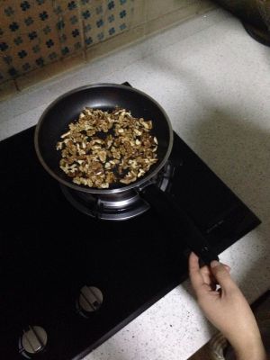 三天时间到…阿胶放锅里隔水蒸,这边生核桃放锅里炒香,红枣剪碎也后放入一起炒香,主要控干些水分,方便存放