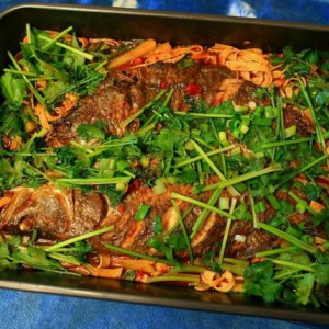 花花这次用的是桂鱼,其实什么鱼都可以,但花花倾向于皮厚的鱼类。鱼洗净清干净腹内,从背部切块,摊开成一片,抹上一层厚油,洒上盐,放于烤盘中,入烤箱,400华氏度烤15分钟。