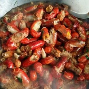 稍有香味,加入龙虾,加糖,酱油,豆瓣酱,翻炒,我口味比较淡,一般不加盐了。稍加点水翻炒