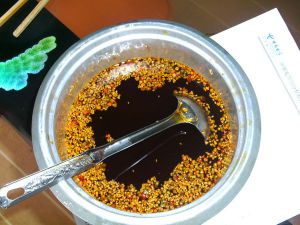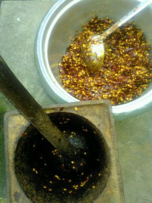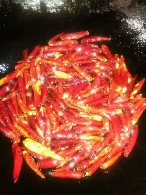 捞出油里的调料(捞出的调料除大葱叶外可以放到装红油的盆中),待油温五成热时放入干辣椒,开微火,当感觉辣椒发脆时捞出沥油晾凉打碎!(这里关键的地方是辣椒烫的程度和辣椒不用打的太碎)