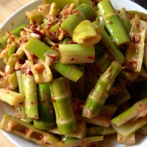 竹笋盐水煮,去麻涩味。捞出冲凉水,拍扁切段。
