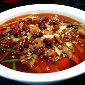 转小火炒片刻,连油快速倒入肉片上,听到辣椒、花椒、蒜粒在盆里跳跃,滋滋作响,咱们的轻奢版水煮肉片就愉快的完成啦!