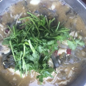 烧开后捞出酸菜放边上,一片片下鱼片。