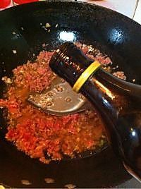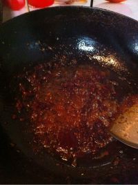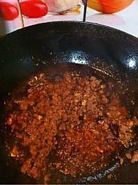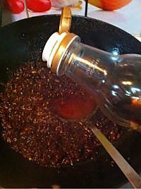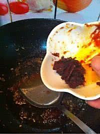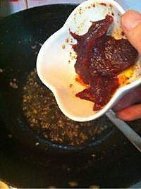 小火翻炒至出红油,放入甜面酱、黄豆酱、番茄沙司