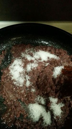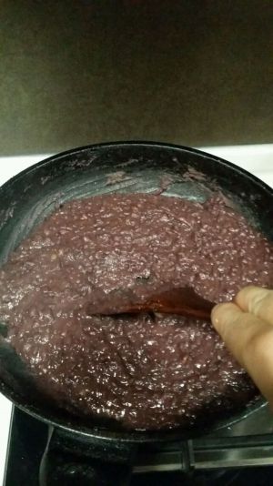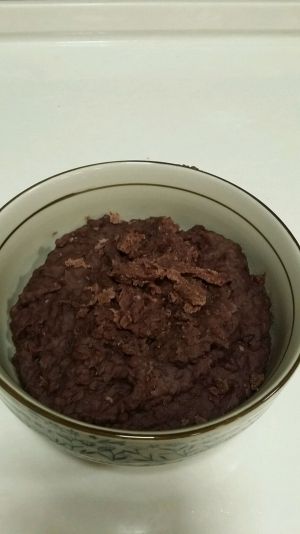 煮好后把红豆按成细细绵绵的,平底锅里放少许油,把红豆放进去翻拌,这时一定要开小火,不然会焦了哦!