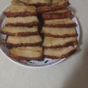 肉切块,放水里煮熟,水里放八角,用筷子可以扎进去就熟了,然后捞出,在皮上涂点米酒和酱油上色,放锅里先炸皮那一面!炸至金黄捞出放入冷水泡一会,那样皮才会软香绵的口感
