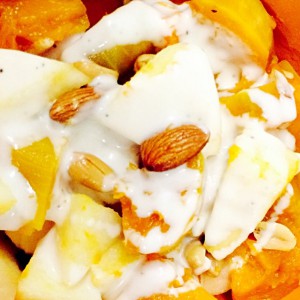 苹果丁、南瓜丁放一起,倒入花生米和杏仁。