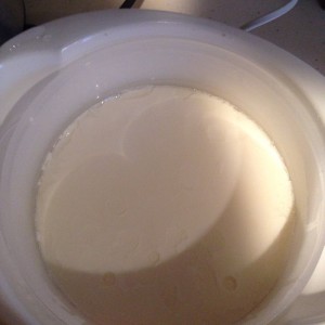 再倒入0.5克酸奶发酵菌,我买的是川之秀,用过酸奶发酵过,1000克倒入半杯酸奶。将盒子盖严放入酸奶机中倒入热水,插电发酵一晚上,等第二天早上八点就好,我现在是晚上七点半做的,