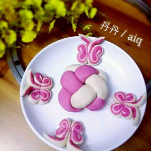 整理好形状,盘子中间放上绣球馒头,四边放上四只刚才做好的双色蝴蝶馒头,凉水放锅中蒸十五分钟!十五分钟后,双色蝴蝶馒头和绣球馒头一锅出!