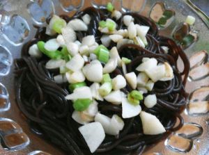 向锅中加入葱花,蒜粒,炒香捞出,加到蕨根粉中