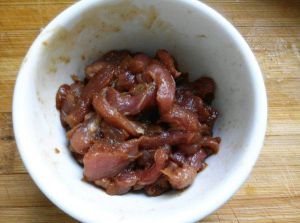 肉切丝,加入少量盐、料酒、淀粉,抓匀,腌制十分钟左右