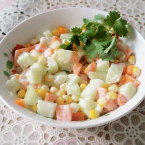 青瓜,胡萝卜削皮用凉开水浸泡会,玉米和松仁剥粒,玉米胡萝卜放锅里煮熟,加点白糖搅拌均匀,放凉后加入黄瓜块,松仁,沙拉搅拌均匀即可,忘了拍细节图了,下次补上!冷藏会味道更好