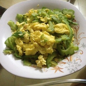 烧热油锅,下鸡蛋,迅速搅拌,这样炒出来的蛋受热均匀,不容易老。鸡蛋炒嫩点没关系,等下还要跟苦瓜一起炒的。