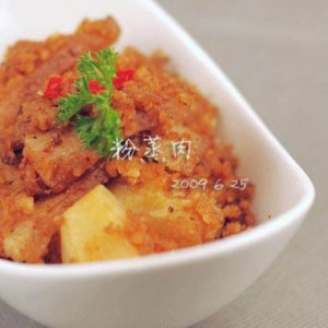蒸格铺上蒸笼布或者蒸笼纸,将拌好土豆先平均铺在底部,土豆铺完后,将肉片排在土豆上面,将碗中剩余的米粉都盖在上面;