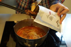 加入半包麻辣牛肉同煮10秒即可(牛肉可按个人喜好分量加入)