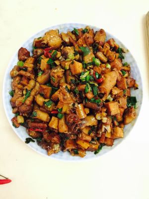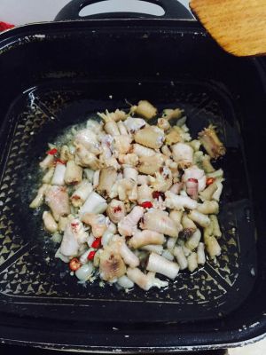 热锅加油 大蒜辣椒爆香 加入鸡爪 中火翻炒 炒至变微黄 加入香干 盐 料酒老抽翻炒