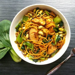 放入蘑菇,翻炒断生,再放入青菜同炒,加盐、胡椒调味