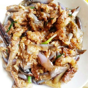 锅内放入两勺油,爆香干辣椒和蒜,然后放入炸好的茄子和肉片。依次加酱油、糖、酒,翻炒一下。