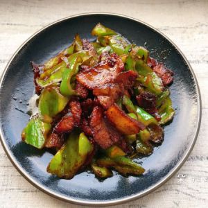 肉片拔一边,小火炒豆瓣酱、再倒入甜面酱炒,加酱油翻炒肉片裹上色,加尖椒中火翻炒断生,出锅.
