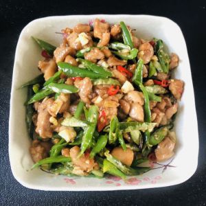 倒入鸡丁,翻炒加入少量糖、盐、蚝油、鸡精,加入小米辣和剩余的蒜末翻炒,滴少许香油出锅