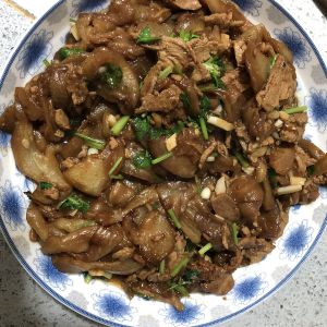 葱蒜炝锅,加入黄豆酱(或者甜面酱)炒黄,放入茄子,翻炒,倒入肉片,加糖、盐,翻炒,放一点热水,继续翻炒。放入蒜末,起锅前加入香菜。