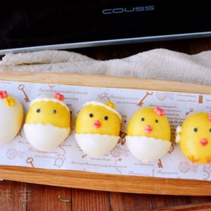 依次给小鸡面团做出装饰,粘的时候沾些水帮助固定,装饰好了,面团也完全发好,轻按表面迅速回弹,水开后上锅蒸8分钟,关火焖5分钟即可。