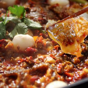 另起一锅加入少许油,放入蒜末、姜末和洋葱碎爆香,加入1袋清油火锅底料、2勺豆瓣酱、10根辣椒段、荔枝果泥和200ml水继续翻炒,待酱汁沸腾后,倒入一小碗淀粉水勾芡。