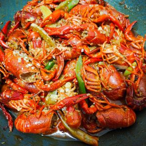 第六步——泡温泉。炒好的香料中加入小龙虾翻炒均匀,加入啤酒继续炖煮15分左右。时间太短很难杀死寄生菌,时间太久会影响口感,所以要把握好小龙虾泡温泉的时间。时间快到时,加入炒好的蒜泥翻炒一下就可以了,鲜香可口,挑战味蕾的香辣蒜泥小龙虾就做好了!