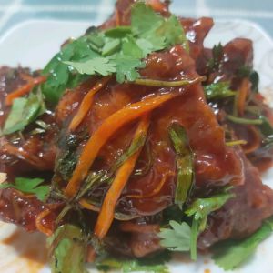 翻炒均匀,撒上胡萝卜丝,葱丝,香菜段,出锅装盘。