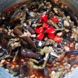 起锅烧少许油,将另一半蒜末置于拌好的茄子上面,热油浇在蒜末上,再次拌匀,放入冰箱冷藏后即可食用