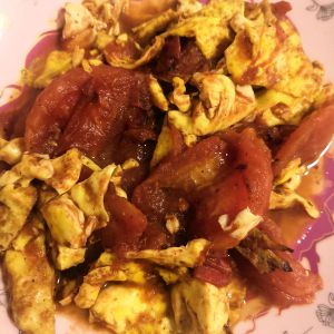 等西红柿软烂的时候把鸡蛋倒进去,用铲子铲成小块鸡蛋,倒入一勺糖,适量盐。