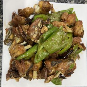 起锅烧油,油热下入鸡肉,油放比油炸少些