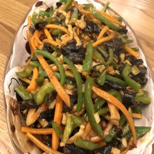 锅中继续下青椒、胡萝卜、木耳炒至断生