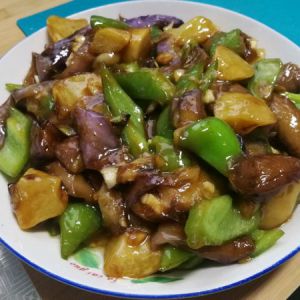 葱蒜如果超香后,加入酱油,一丢丢水,蚝油(一定要小心,蚝油下锅会嘣,所以我都是酱油和水放完才放它),炒出香味。因为茄子和土豆都已经炸熟,所以青椒先入锅翻炒五六下,土豆和茄子一起加入锅中,放盐,鸡精,糖,翻炒均匀,手速要快点,要不茄子就该熟烂了