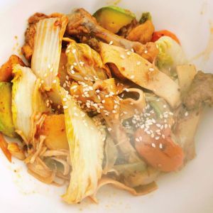 5⃣️鸡肉捞出,重新倒油,入葱段,蒜片,姜片煸炒,放入土豆片,西葫芦片,萝卜片,倒入海底捞的香锅底料,味极鲜和蚝油调味,加水煮开后加入豆腐豆腐皮,宽粉,木耳,再次煮开。等到所有食材都熟了就可以啦。(⚠️不能吃辣得小可爱,可以实施芝麻酱调汤底)