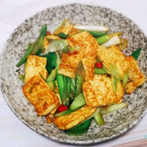 把煎好的豆腐推至锅的一边,倒入小米辣姜丝和青蒜苗在油里翻炒
