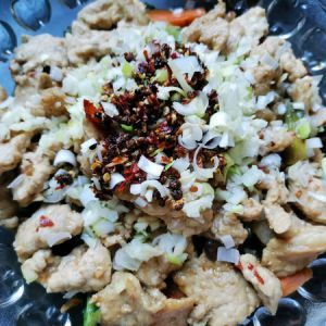 撒上蒜粒,葱粒和之前炒好的辣椒花椒粒