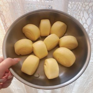 揉成这样的光滑面团用保鲜膜或者碟子盖着 夏天室温发酵一小时就可以 冬天用锅隔着热水发酵一小时左右 我用的是烤箱提前预热发酵 直到面团发到两倍大小左右 撕开明显看到密密的组织 这里我图片误删了 所以没得图洛 哈哈